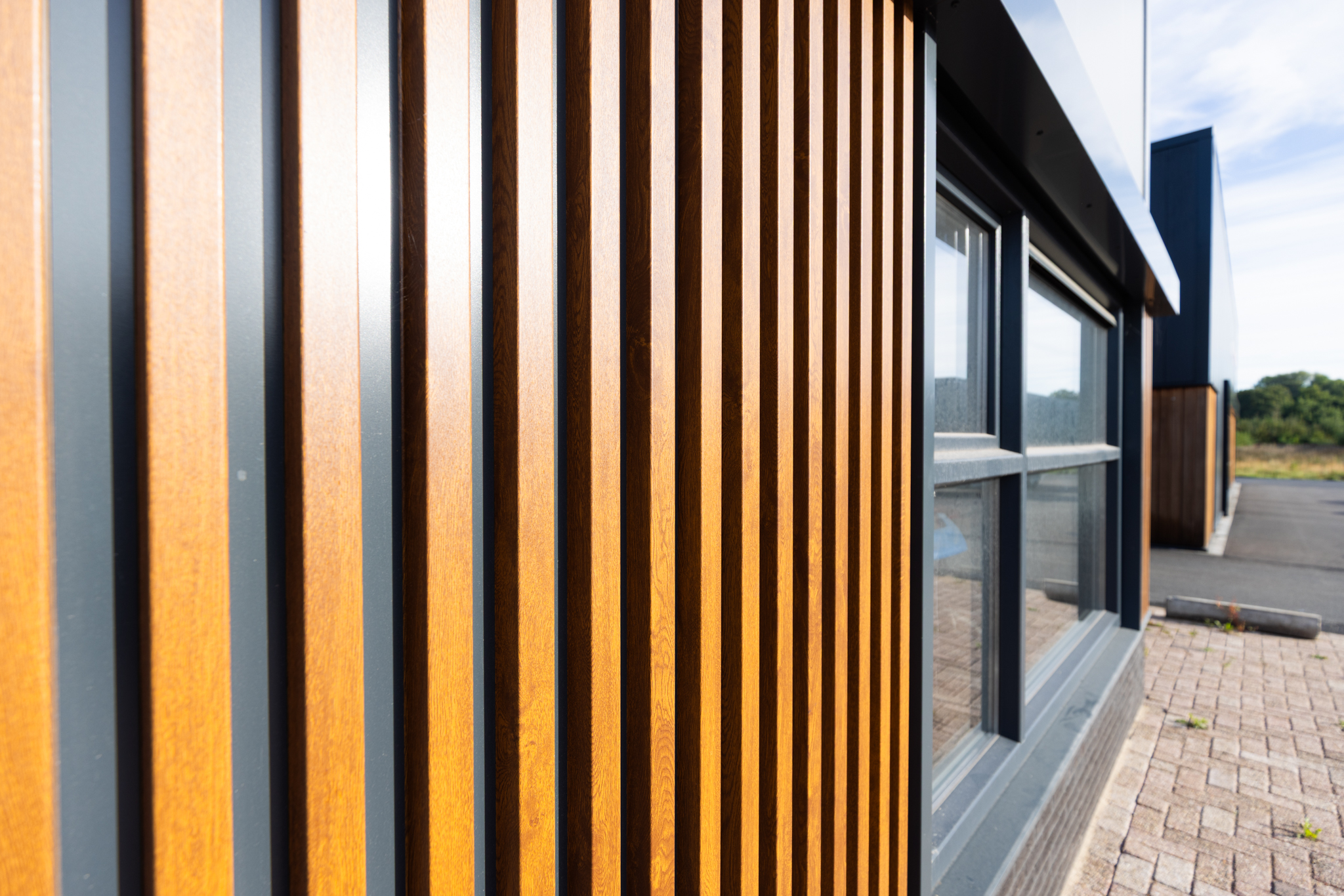 Drie jaar na de oplevering van de eerste twee bedrijfsverzamelgebouwen volgde in 2025 het derde pand, dat qua afmetingen groter is (750 m²), maar qua uitstraling perfect in het rijtje past. Hein: "Het voordeel was dat we nu zelf ook ervaring hadden met het bouwen van zo'n pand. Daardoor konden we nog sneller schakelen met Havinga. Wat ons daarbij opviel, is de persoonlijke betrokkenheid van Jan. Zo zag hij bijvoorbeeld dat het red ceder hout op de gevels van de eerste twee gebouwen was verkleurd door de zon. Jan kwam met het voorstel om damwandprofiel te gebruiken, dat als twee druppels water lijkt op echt hout. Daarmee voorkom je verkleuring en maak je de gevel bovendien veel gemakkelijker schoon. We hebben dit toegepast in alle drie de panden. Daardoor zien ze er nu precies hetzelfde uit aan de voorzijde."